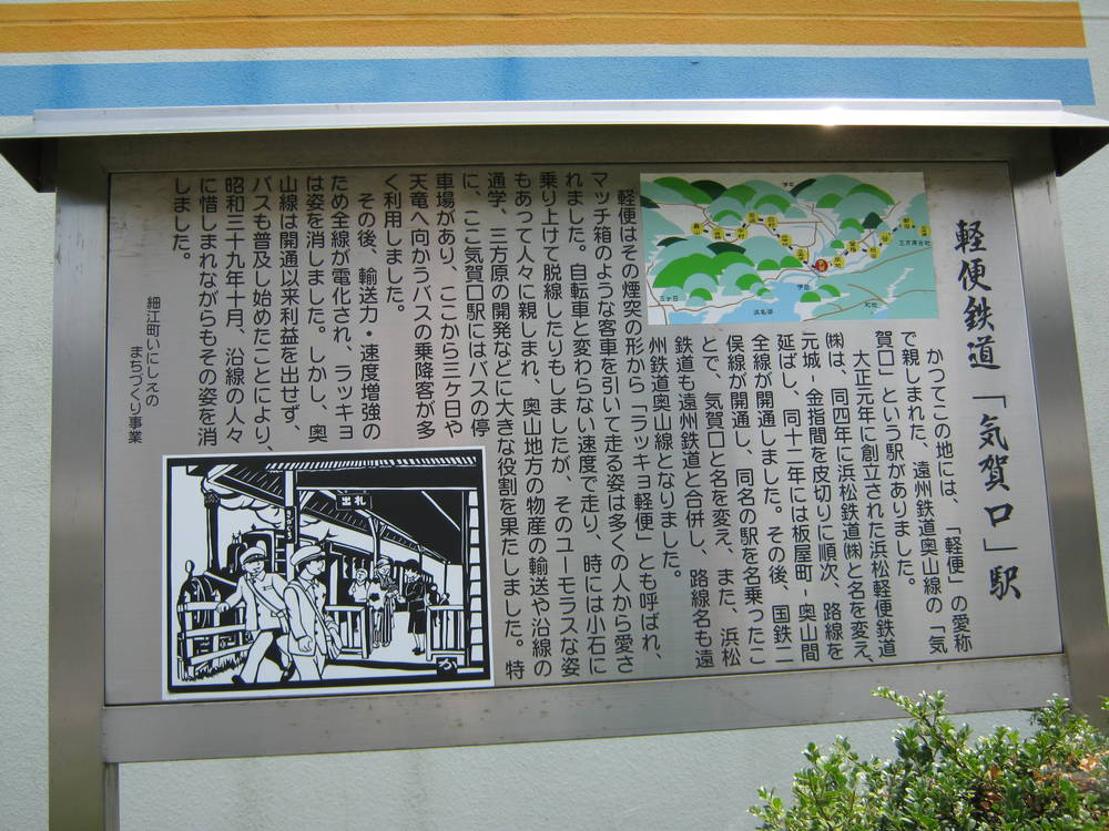 相方が気賀口駅跡はハローワークになっているよと調べてくれて、そこに行ってみたら、奥山線の説明看板が建ってたんだ。